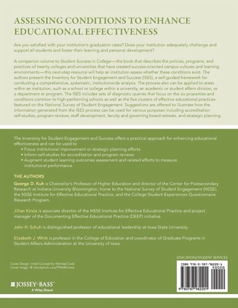 Are you satisfied with your institution's graduation rates? Does your institution adequately challenge and support all students and foster their learning and personal development? A companion volume to Student Success in College--the book that describes the policies, programs, and practices of twenty colleges and universities that have created success-oriented campus cultures and learning environments--this next-step resource will help an institution assess whether these conditions exist. The authors present the Inventory for Student Engagement and Success (ISES), a self-guided framework for conducting a comprehensive, systematic, institutionwide analysis. The process also can be applied to areas within an institution, such as a school or college within a university, an academic or student affairs division, or a department or program. The ISES includes sets of diagnostic queries that focus on the six properties and conditions common to high-performing schools as well as the five clusters of effective educational practices featured on the National Survey of Student Engagement. Suggestions are offered to illustrate how the information generated from the ISES process can be used for various purposes including accreditation self-studies, program reviews, staff development, faculty and governing board retreats, and strategic planning. The Inventory for Student Engagement and Success offers a practical approach for enhancing educational effectiveness and can be used to * Focus institutional improvement or strategic planning efforts * Inform self-studies for accreditation and program reviews * Augment student learning outcomes assessment and related efforts to measure institutional performance