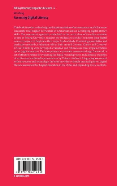 This book introduces the design and implementation of an assessment model for a new university-level English curriculum in China that aims at developing digital literacy skills. The assessment approach, embedded in the curriculum of an online modular course at Peking University, requires the students to conduct semester-long digital research projects in English in their major fields of study. Combining quantitative and qualitative methods, evaluation rubrics built around Content, Clarity, and Creative/Critical Thinking were developed, evaluated, and refined over three implementation cycles (eight semesters). The book presents a systematic assessment design framework, a set of effective rubrics for evaluating the digital research project, and authentic examples of written and multimedia presentations by Chinese students. Integrating assessment with instruction and technology, the book provides a valuable practical guide to digital literacy assessment for English education in the Outer and Expanding Circle contexts.