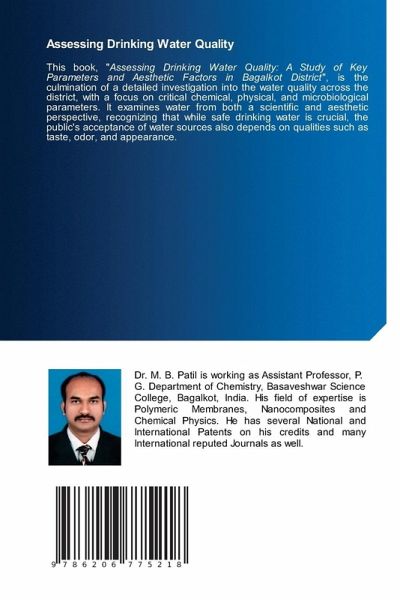 This book, "Assessing Drinking Water Quality: A Study of Key Parameters and Aesthetic Factors in Bagalkot District", is the culmination of a detailed investigation into the water quality across the district, with a focus on critical chemical, physical, and microbiological parameters. It examines water from both a scientific and aesthetic perspective, recognizing that while safe drinking water is crucial, the public's acceptance of water sources also depends on qualities such as taste, odor, and appearance.