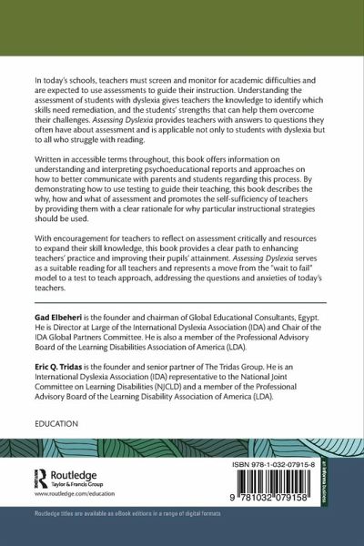 In today's schools, teachers must screen and monitor for academic difficulties and are expected to use assessments to guide their instruction. Understanding the assessment of students with dyslexia gives teachers the knowledge to identify which skills need remediation, and the students' strengths that can help them overcome their challenges. Assessing Dyslexia provides teachers with answers to questions they often have about assessment and is applicable not only to students with dyslexia but to all who struggle with reading.