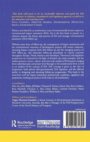 Written and edited by an authoritative team of internationally known experts in environmental impact assessment (EIA), this is the first book to present in a coherent manner the theory and practice of EIA and strategic environmental assessment (SEA) follow-up. Without some form of follow-up, the consequences of impact assessments and the environmental outcomes of development projects will remain unknown. Assessing Impact examines both EIA follow-up and the emerging practice of SEA follow-up, and showcases follow-up procedures in various countries throughout Europe, North America and Australasia. Theoretical and legislative perspectives are examined in the light of detailed case study examples, and the authors present a micro-, macro- and meta scale analysis of EIA practice ranging from individual plan and project level through to the jurisdictional level, as well as an analysis of the concept of EIA. Full coverage is given to the roles of proponents, both private and governmental, EIA regulators and the affected public in designing and executing follow-up programmes. This book is the must-have tool for impact assessment professionals, academics, regulators and proponents working on projects of all scales in all jurisdictions.
