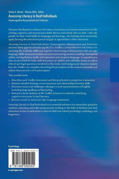 Assessing Literacy in Deaf Individuals: Neurocognitive Measurement and Predictors narrows these gaps by introducing the VL2 Toolkit, a comprehensive test battery for assessing the academic skills and cognitive functioning of deaf persons who use sign language. Skills measured include executive functioning, memory, reading, visuospatial ability, writing fluency, math, and expressive and receptive language. Comprehensive data are provided for each, with discussion of validity and reliability issues as well as ethical and legal questions involved in the study. And background chapters explain how the Toolkit was compiled, describing the procedures of the study, its rationale, and salient characteristics of its participants. This notable book: