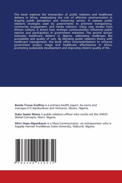 This book explores the intersection of public relations and healthcare delivery in Africa, emphasizing the role of effective communication in shaping public perception and enhancing service. It assesses public relations strategies used by governments to promote transparency, community engagement, and media relations. Using case studies from African nations, it shows how strategic communication influences public opinion and participation in government initiatives. The second section evaluates healthcare delivery in Nigeria, addressing challenges like accessibility and quality of care. By blending public relations theory with healthcare management, the book offers recommendations to enhance government project image and healthcare effectiveness in Africa, promoting sustainable development and improving citizens' quality of life.