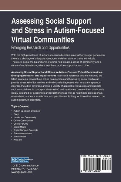 With the high prevalence of autism spectrum disorders among the younger generation, there is a shortage of adequate resources to deliver care for these individuals. Therefore, social media and online forums help create a sense of community and a sense of social network, where members provide support for each other. Assessing Social Support and Stress in Autism-Focused Virtual Communities: Emerging Research and Opportunities is a critical reference volume featuring the latest academic research on online communities and how using social media can provide stress relief for families and individuals diagnosed with an autism spectrum disorder. Including coverage among a variety of applicable viewpoints and subjects such as social media concepts, stress relief, and healthcare communities, this book is ideally designed for academics and practitioners as well as healthcare professionals, researchers, students, academics, and practitioners looking for innovative research on autism spectrum disorders.