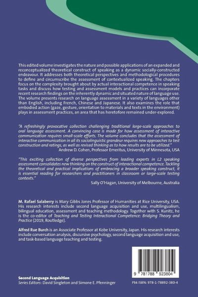 This book takes a critical perspective of research on assessing speaking in second and foreign languages. Chapters focus on the complexity brought about by actual interactional competence in speaking tasks and discuss how testing and assessment models and practices can incorporate recent research on the dynamic and situated nature of language use.