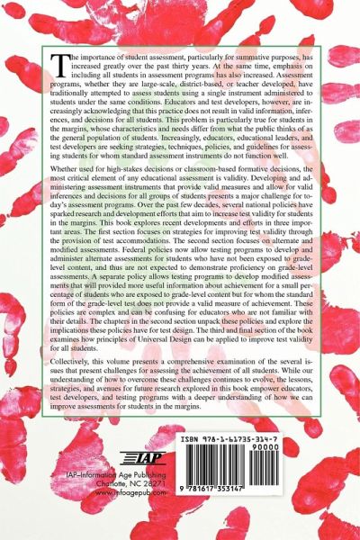 The importance of student assessment, particularly for summative purposes, has increased greatly over the past thirty years. At the same time, emphasis on including all students in assessment programs has also increased. Assessment programs, whether they are large-scale, district-based, or teacher developed, have traditionally attempted to assess students using a single instrument administered to students under the same conditions. Educators and test developers, however, are increasingly acknowledging that this practice does not result in valid information, inferences, and decisions for all students. This problem is particularly true for students in the margins, whose characteristics and needs differ from what the public thinks of as the general population of students. Increasingly, educators, educational leaders, and test developers are seeking strategies, techniques, policies, and guidelines for assessing students for whom standard assessment instruments do not function well. Whether used for high-stakes decisions or classroom-based formative decisions, the most critical element of any educational assessment is validity. Developing and administering assessment instruments that provide valid measures and allow for valid inferences and decisions for all groups of students presents a major challenge for today's assessment programs. Over the past few decades, several national policies have sparked research and development efforts that aim to increase test validity for students in the margins. This book explores recent developments and efforts in three important areas. The first section focuses on strategies for improving test validity through the provision of test accommodations. The second section focuses on alternate and modified assessments. Federal policies now allow testing programs to develop and administer alternate assessments for students who have not been exposed to grade-level content, and thus are not expected to demonstrate proficiency on grade-level assessments. A separate policy allows testing programs to develop modified assessments that will provided more useful information about achievement for a small percentage of students who are exposed to grade-level content but for whom the standard form of the grade-level test does not provide a valid measure of achievement. These policies are complex and can be confusing for educators who are not familiar with their details. The chapters in the second section unpack these policies and explore the implications these policies have for test design. The third and final section of the book examines how principles of Universal Design can be applied to improve test validity for all students. Collectively, this volume presents a comprehensive examination of the several issues that present challenges for assessing the achievement of all students. While our understanding of how to overcome these challenges continues to evolve, the lessons, strategies, and avenues for future research explored in this book empower educators, test developers, and testing programs with a deeper understanding of how we can improve assessments for students in the margins.