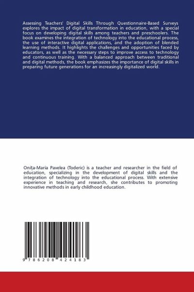 Assessing Teachers' Digital Skills Through Questionnaire-Based Surveys explores the impact of digital transformation in education, with a special focus on developing digital skills among teachers and preschoolers. The book examines the integration of technology into the educational process, the use of interactive digital applications, and the adoption of blended learning methods. It highlights the challenges and opportunities faced by educators, as well as the necessary steps to improve access to technology and continuous training. With a balanced approach between traditional and digital methods, the book emphasizes the importance of digital skills in preparing future generations for an increasingly digitalized world.