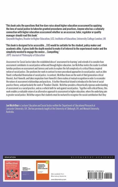 Assessment for Social Justice takes the established idea of 'assessment for learning' and extends it to consider how assessment contributes to social justice within and through higher education. Jan McArthur invites the reader to rethink familiar positions on assessment and fairness and seeks to explore the full complexity of a critical theory-inspired notion of social justice. She positions her work in contrast to more procedural approaches to social justice, such as John Rawls's influential theorisation of social justice. In contrast, McArthur draws on the work of third generation critical theorist, Axel Honneth, and takes inspiration from Honneth's three realms of mutual recognition in order to reconsider the nature of assessment relationships and practices. A further theoretical strand is introduced in the form of social practice theory, and particularly the work of Theodore Shatzki. McArthur provides a theoretically rigorous understanding of assessment as a social practice, and as a vehicle both for and against social justice. Together with critical theory, this work enables a realizable vision of an alternative approach to assessment in higher education, where the underlying aim is greater social justice. McArthur argues that students must be nurtured to recognise the social contribution that they can make as a result of engaging with knowledge in higher education, rather than defining their achievements in terms of a mark, grade or degree classification.
