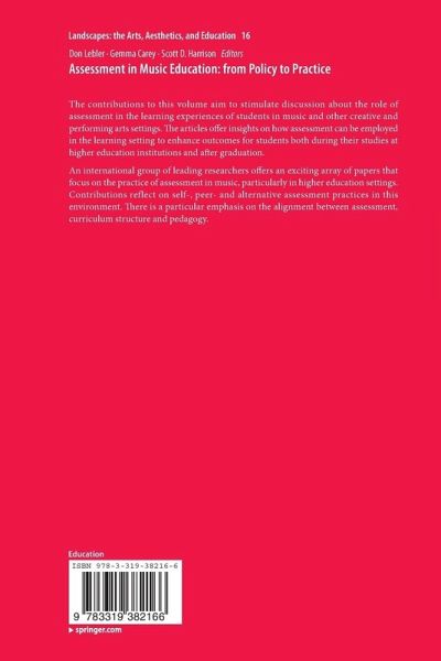 Glossary.- 1. Future Directions for Assessment in Music.- 2. Backwards Assessment Explanations: Implications for Teaching and Assessment Practice.- 3. Assessment in Music in the European Context: The Polifonia Project.- 4. Assessment in Music in the Australian Context: The AiM Project.- 5. Challenging Approaches to Assessment of Instrumental Learning.- 6. The Bachelor of Music: Purpose, Desires and Requirements.- 7. Participants' Perceptions of the Role of Fair and Valid Assessment Tasks in Tertiary Music Education.- 8. Assessment and Critical Feedback in the Master-apprentice Relationship: Rethinking Approaches to the Learning of a Music Instrument.- 9. Assessing Music Performance Process and Outcome through a Rubric: Ways and Means.- 10. Embedding Creative and Critical Thinking in Performance Studies - the Challenge.- 11. A Search for Balance: The Development of a Performance Assessment form for Classical Instrumental Music in the Tertiary Context.- 12. Linking Assessment Practices, Unit-level Outcomes, and Discipline Specific Capabilities in Contemporary Music Studies.- 13. New Wine in Old Bottles: Aligning Curricula, Pedagogy and Assessment through Creative Practice in Classical and Contemporary Music.- 14. Assessments for Music Theory: Three Situations.- 15. The BoPMAT: Bachelor of Music Popular Music Program.- 16. The Amazing Marking Machine. A Process for Authentic, Efficient Assessment.- 17. Assessment and Feedback in Curricula Design for Contemporary Vocal Studies.- 18. Musical Theatre Assessment: Perspectives on the Efficacy of Continuous Assessment.- 19. Aligning Student Attitudes, Assessment, and Curriculum Design: A Case Study using "My Life as a Musician" Vocational Preparation Strand.- Concluding Thoughts: Assessment in Music for the 21st Century.
