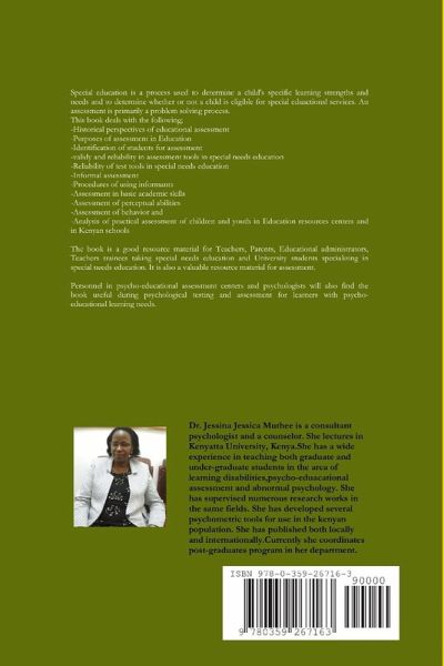 This book deals with purposes of assessment in special education;Identification of student for assessment;Validity and reliability of test tools in assessment;Informal assessments of learners;Procedures of using Informants;Assessment in basic academic skills,perceptual abilities,behavior and analysis of practical assessment of children and youth in the education resource centers and Kenyan schools.