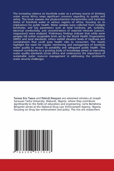 The increasing reliance on borehole water as a primary source of drinking water across Africa raises significant concerns regarding its quality and safety. This book assesses the physicochemical characteristics and hardness status of borehole water in various regions of Africa, focusing on its implications for public health. Water samples were collected from multiple boreholes, and key parameters such as total hardness, pH, turbidity, electrical conductivity, and concentrations of essential minerals (calcium, magnesium) were analyzed. Preliminary findings indicate that while some samples fall within acceptable limits set by the World Health Organization (WHO) and local standards, others exhibit elevated levels of hardness and contaminants that could pose health risks to consumers. The results highlight the need for regular monitoring and management of borehole water quality to ensure its potability and safeguard public health. This research contributes to a growing body of knowledge aimed at improving water quality standards across Africa and underscores the importance of sustainable water resource management in addressing the continent's water security challenges.