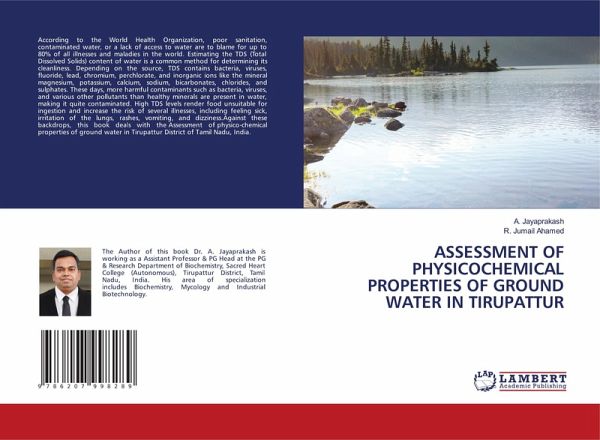 According to the World Health Organization, poor sanitation, contaminated water, or a lack of access to water are to blame for up to 80% of all illnesses and maladies in the world. Estimating the TDS (Total Dissolved Solids) content of water is a common method for determining its cleanliness. Depending on the source, TDS contains bacteria, viruses, fluoride, lead, chromium, perchlorate, and inorganic ions like the mineral magnesium, potassium, calcium, sodium, bicarbonates, chlorides, and sulphates. These days, more harmful contaminants such as bacteria, viruses, and various other pollutants than healthy minerals are present in water, making it quite contaminated. High TDS levels render food unsuitable for ingestion and increase the risk of several illnesses, including feeling sick, irritation of the lungs, rashes, vomiting, and dizziness.Against these backdrops, this book deals with the Assessment of physico-chemical properties of ground water in Tirupattur District of Tamil Nadu, India.