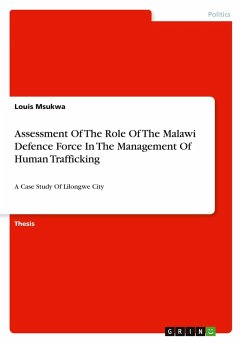 Thesis from the year 2025 in the subject Politics - Other International Politics Topics, , language: English, abstract: Human trafficking remains a significant and persistent challenge in Malawi, with the country serving as a source, transit, and destination for victims of various forms of exploitation, including forced labour, sexual exploitation, and child trafficking. This study investigates the role of the Malawi Defence Force (MDF) in combating human trafficking, with a focus on its operations within Lilongwe City. Guided by Human Security Concept, Social Network Theory, Institutional Theory, and Securitization Theory the research evaluates the extent to which the MDF contributes to border security, victim rescue missions, and inter-agency collaborations aimed at dismantling trafficking networks. The research indicates that the MDF plays a supportive but increasingly strategic role in national anti-trafficking efforts. The Force's contributions include surveillance of high-risk border areas, tactical support during rescue missions, and limited but growing participation in inter-agency training and coordination efforts. However, challenges persist in the form of jurisdictional overlaps, limited resources, weak inter-agency communication, and absence of clear operational protocols. The study recommends the establishment of a National Anti-Trafficking Command Centre (NATCC) to facilitate intelligence sharing, coordinated responses, and cross-border collaboration. It also calls for the integration of trafficking awareness into MDF training curricula, improved institutional mandates, and broader stakeholder engagement. The findings contribute to the body of literature by offering new insights into the military's evolving role in human trafficking prevention and the need for cohesive, multi-sectoral strategies in Malawi.