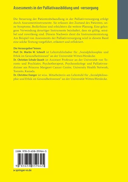 ¿Prof. Dr. Martin W. Schnell ist Lehrstuhlinhaber für "Sozialphilosophie und Ethik im Gesundheitswesen" an der Universität Witten/Herdecke. Dr. Christian Schulz-Quach ist Assistant Professor an der Universität von Toronto und Psychiater, Psychotherapeut, Psychoonkologe und Palliativmediziner am Princess Margaret Cancer Centre, University Health Network, Toronto, Kanada. Dr. Christine Dunger ist wiss. Mitarbeiterin am Lehrstuhl für "Sozialphilosophie und Ethik im Gesundheitswesen" an der Universität Witten/Herdecke.