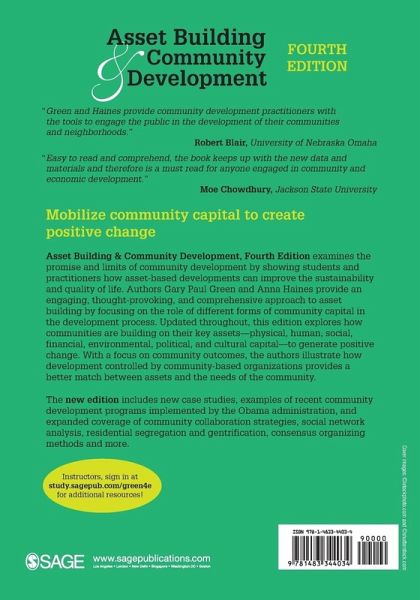 A comprehensive approach focused on sustainable change Asset Building and Community Development, Fourth Edition examines the promise and limits of community development by showing students and practitioners how asset-based developments can improve the sustainability and quality of life. Authors Gary Paul Green and Anna Haines provide an engaging, thought-provoking, and comprehensive approach to asset building by focusing on the role of different forms of community capital in the development process. Updated throughout, this edition explores how communities are building on their key assets—physical, human, social, financial, environmental, political, and cultural capital— to generate positive change. With a focus on community outcomes, the authors illustrate how development controlled by community-based organizations provides a better match between assets and the needs of the community.