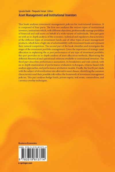 This book analyses investment management policies for institutional investors. It is composed of four parts. The first one analyses the various types of institutional investors, institutions which, with different objectives, professionally manage portfolios of financial and real assets on behalf of a wide variety of individuals. This part goes on with an in-depth analysis of the economic, technical and regulatory characteristics of the different types of investment funds and of other types of asset management products, which have a high rate of substitutability with investment funds and represent their natural competitors. The second part of the book identifies and investigates the stages of the investment portfolio management. Given the importance of strategic asset allocation in explaining the ex post performance of any type of investment portfolio, this part provides an in-depth analysis of asset allocation methods, illustrating the different theoretical and operational solutions available to institutional investors. The third part describes performance assessment, its breakdown and risk control, with an in-depth examination of performance evaluation techniques, returns-based style analysis approaches, and performance attribution models. Finally, the fourth part deals with the subject of diversification into alternative asset classes, identifying the common characteristics and their possible role within the framework of investment management policies. This part analyses hedge funds, private equity, real estate, commodities, and currency overlay techniques.
