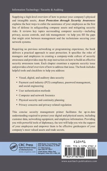 Supplying a high-level overview of how to protect your company's physical and intangible assets, this book explains how to enlist the assistance of your employees as the first line of defense in safeguarding company assets and mitigating security risks. It reviews key topics surrounding computer security and provides detailed instruction on how to put together an effective security awareness team. Requiring no previous networking or programming experience, the book specifies managers' and employees' roles in establishing a company-wide culture of security awareness.