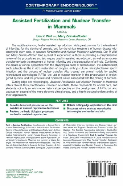 Part I. Assisted Fertilization. Developments in Animal Reproductive Biotechnology, Robert H. Foote. Advances in Animal In Vitro Fertilization, Benjamin G. Brackett. Control of Oocyte Nuclear and Cytoplasmic Maturation, Gary D. Smith. In Vitro Oocyte Maturation: Human Aspects, Jeffrey B. Russell. Measurement of Reproductive Potential in the Human Female, Philip E. Patton. Imaging Technology in Assisted Reproduction, Roger A. Pierson. Intracytoplasmic Sperm Injection or Conventional Fertilization to Maximize the Number of Viable Embryos, Susan E. Lanzendorf and Catherine Boyd. The Production of Viable Human Blastocyts: The Evolution of Sequential Culture Systems, Thomas B. Poole and Joseph E. Martin. Embryo Transfer: A Concise and Practical Summary of the Techniques, Kenneth A. Burry. Cryopreservation of Mammalian Embryos, Gametes, and Ovarian Tissue: Current Issues and Progress, William F. Rall. Satellite and Transport In Vitro Fertilization, Paul F. Kaplan, Douglas J Austin, and Marsha J. Gorrill. Assisted Reproductive Laboratory: Quality Control, Quality Assurance, and Continuous Quality Improvement in a Regulatory Environment, William Byrd. Part II. Nuclear Transfer. Somatic Cell Nuclear Transplantation in Cattle, James M. Robl. Nuclear Modifications and Reprogramming After Nuclear Transfer, Randall S. Prather. Application of ARTs and Nuclear Transfer in Exotic or Endangered Species, Kenneth L. White, Thomas D. Bunch, Shoukhrat Mitalipov, and William A. Reed. Assisted Fertilization and Nuclear Transfer in Nonhuman Primates, Nadia Ouhibi, Mary B. Zelinski-Wooten, James A. Thomson, and Don P. Wolf. Cloning and Nuclear Transfer in Humans, Don P. Wolf. Index