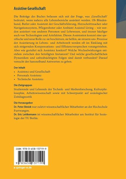Die Beiträge des Buches befassen sich mit der Frage, was 'Gesellschaft' bedeutet, wenn nahezu alle Lebensbereiche assistiert werden. Ob Blindenhund, Butler oder Assistent der Geschäftsführung, Herzschrittmacher oder Navigationssystem, Pflegeroboter oder Ambient Assisted Living - wir werden assistiert von anderen Personen und Lebewesen, und immer häufiger auch von Technologien und Artefakten. Diesen Assistenten kommt eine spezifische und neue Rolle zu: sie beschützen, sie helfen, sie steuern uns. Prozesse der Assistierung in Lebens- und Arbeitswelt werden oft im Einklang mit sich steigernden Kompensations- und Effizienzversprechen vorangetrieben. Aber wie gestaltet sich Assistenz konkret? Welche Wechselwirkungen entstehen zwischen den beteiligten Instanzen? Und welche gesellschaftlichen Dynamiken und unbeabsichtigten Folgen sind damit verbunden? Darauf versucht der Sammelband Antworten zu geben.