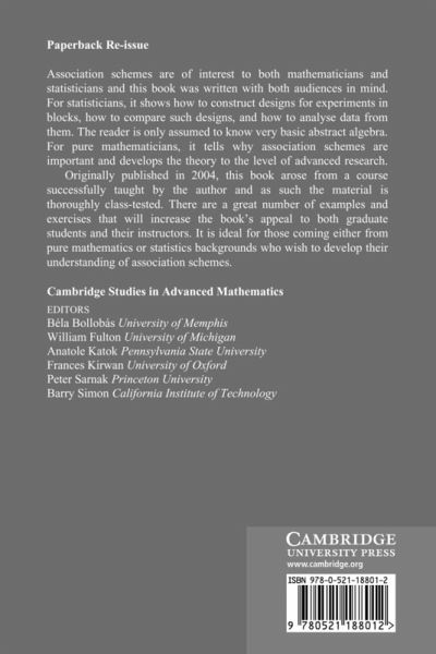 Association schemes are of interest to both mathematicians and statisticians and this book was written with both audiences in mind. For statisticians, it shows how to construct designs for experiments in blocks, how to compare such designs, and how to analyse data from them. The reader is only assumed to know very basic abstract algebra. For pure mathematicians, it tells why association schemes are important and develops the theory to the level of advanced research. This book arose from a course successfully taught by the author and as such the material is thoroughly class-tested. There are a great number of examples and exercises that will increase the book's appeal to both graduate students and their instructors. It is ideal for those coming either from pure mathematics or statistics backgrounds who wish to develop their understanding of association schemes.