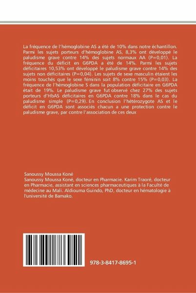La fréquence de l'hémoglobine AS a été de 10% dans notre échantillon. Parmi les sujets porteurs d'hémoglobine AS, 8,3% ont développé le paludisme grave contre 14% des sujets normaux AA (P=0,01). La fréquence du déficit en G6PDA a été de 14%. Parmi les sujets déficitaires 10,53% ont développé le paludisme grave contre 14% des sujets non déficitaires (P=0,04). Les sujets de sexe masculin étaient les moins touchés que le sexe féminin soit 8% contre 15% (P=0,03). La fréquence de l'hémoglobine S dans la population déficitaire en G6PDA était de 19%. Le paludisme grave fut observé chez 27% des sujets porteurs d'HbAS déficitaires en G6PDA contre 18% dans le cas du paludisme simple (P=0,29). En conclusion l'hétérozygote AS et le déficit en G6PDA sont associés chacun a une protection contre le paludisme grave, par contre l'association de ces deux