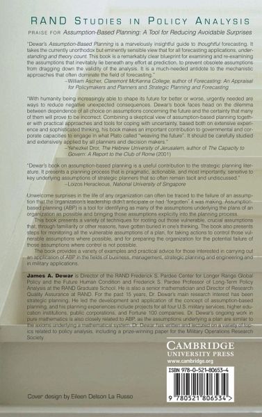 Unwelcome surprises in the life of any organization can often be traced to the failure of an assumption that the organization's leadership didn't anticipate or had 'forgotten' it was making. Assumption-based planning (ABP) is a tool for identifying as many as possible of the assumptions underlying the plans of an organization and bringing those assumptions explicitly into the planning process. This book presents a variety of techniques for rooting out those vulnerable, crucial assumptions. The book also presents steps for monitoring all the vulnerable assumptions of a plan, for taking actions to control those vulnerable assumptions where possible, and for preparing the organization for the potential failure of those assumptions where control is not possible. The book provides a variety of examples and practical advice for those interested in carrying out an application of ABP in the fields of business, management, strategic planning, engineering, and in military applications.