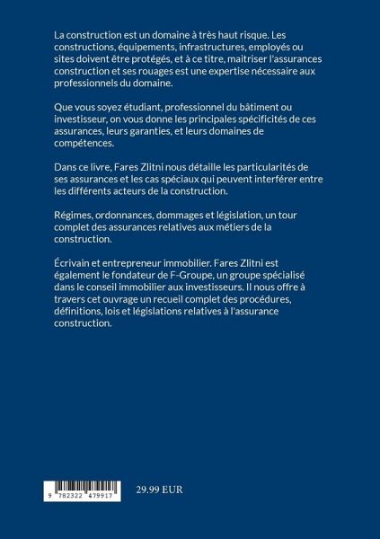 La construction est un domaine à très haut risque. Les constructions, équipements, infrastructures, employés ou sites doivent être protégés, et à ce titre, maitriser l'assurances construction et ses rouages est une expertise nécessaire aux professionnels du domaine.Que vous soyez étudiant, professionnel du bâtiment ou investisseur, on vous donne les principales spécificités de ces assurances, leurs garanties, et leurs domaines de compétences.Dans ce livre, Fares Zlitni nous détaille les particularités de ses assurances et les cas spéciaux qui peuvent interférer entre les différents acteurs de la construction.Régimes, ordonnances, dommages et législation, un tour complet des assurances relatives aux métiers de la construction.Écrivain et entrepreneur immobilier. Fares Zlitni est également le fondateur de F-Groupe, un groupe spécialisé dans le conseil immobilier aux investisseurs. Il nous offre à travers cet ouvrage un recueil complet des procédures, définitions, lois et législations relatives à l'assurance construction.