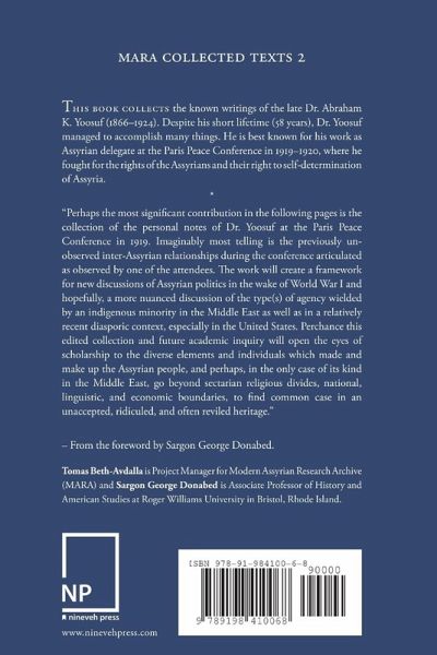 This book collects the known writings of the late Dr. Abraham K. Yoosuf (1866-1924). Despite his short lifetime (58 years), Dr. Yoosuf managed to accomplish many things. He is best known for his work as Assyrian delegate at the Paris Peace Conference in 1919-1920, where he fought for the rights of the Assyrians and their right to self-determination of Assyria.