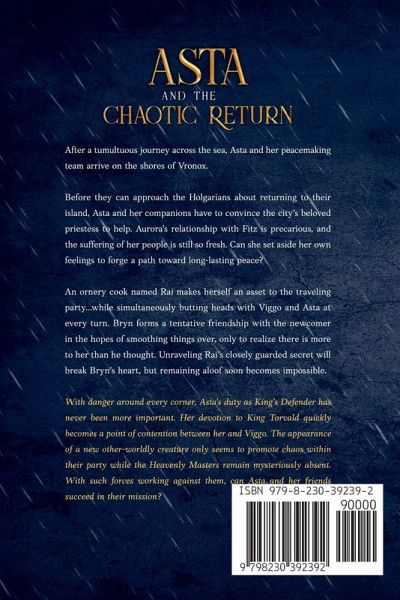 After a tumultuous journey across the sea, Asta and her peacemaking team arrive on the shores of Vronox. Before they can approach the Holgarians about returning to their island, Asta and her companions have to convince the city's beloved priestess to help. Aurora's relationship with Fitz is precarious, and the suffering of her people is still so fresh. Can she set aside her own feelings to forge a path toward long-lasting peace? An ornery cook named Rai makes herself an asset to the traveling party...while simultaneously butting heads with Viggo and Asta at every turn. Bryn forms a tentative friendship with the newcomer in the hopes of smoothing things over, only to realize there is more to her than he thought. Unraveling Rai's closely guarded secret will break Bryn's heart, but remaining aloof soon becomes impossible. With danger around every corner, Asta's duty as King's Defender has never been more important. Her devotion to King Torvald quickly becomes a point of contention between her and Viggo. The appearance of a new other-worldly creature only seems to promote chaos within their party while the Heavenly Masters remain mysteriously absent. With such forces working against them, can Asta and her friends succeed in their mission?
