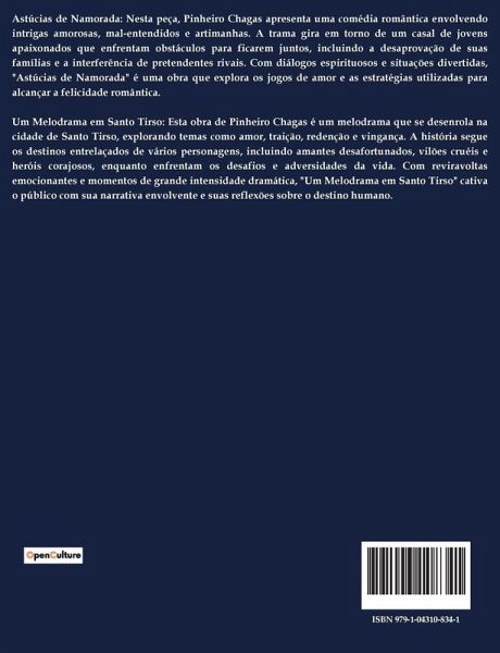 Astúcias de Namorada: Nesta peça, Pinheiro Chagas apresenta uma comédia romântica envolvendo intrigas amorosas, mal-entendidos e artimanhas. A trama gira em torno de um casal de jovens apaixonados que enfrentam obstáculos para ficarem juntos, incluindo a desaprovação de suas famílias e a interferência de pretendentes rivais. Com diálogos espirituosos e situações divertidas, "Astúcias de Namorada" é uma obra que explora os jogos de amor e as estratégias utilizadas para alcançar a felicidade romântica. Um Melodrama em Santo Tirso: Esta obra de Pinheiro Chagas é um melodrama que se desenrola na cidade de Santo Tirso, explorando temas como amor, traição, redenção e vingança. A história segue os destinos entrelaçados de vários personagens, incluindo amantes desafortunados, vilões cruéis e heróis corajosos, enquanto enfrentam os desafios e adversidades da vida. Com reviravoltas emocionantes e momentos de grande intensidade dramática, "Um Melodrama em Santo Tirso" cativa o público com sua narrativa envolvente e suas reflexões sobre o destino humano.