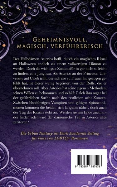 Geheimnisvoll, magisch, verführerisch Die Urban Fantasy im Dark Academia Setting für Fans von LGBTQ+ Romanen Der Halbdämon Asterios hofft, durch ein magisches Ritual an Halloween endlich zu einem vollwertigen Dämon zu werden. Doch die wichtigste Zutat dafür ist gar nicht so leicht zu finden: eine Jungfrau. Als Asterios an der Princeton University auf Caleb trifft, der sich nie zu Frauen hingezogen gefühlt hat, ist dieser wenig begeistert von der Rolle, die er übernehmen soll. Aber Asterios hat seine eigenen Methoden, seinen Willen zu bekommen und so hilft Caleb ihm sogar bei der gefährlichen Suche nach den restlichen acht Zutaten. Zwischen blutdürstigen Vampiren und giftigen Spinnendämonen kommen die beiden sich langsam näher, doch auch der Tag des Rituals steht an. Werden sie am Ende zueinander finden oder wird der dämonische Teil in Asterios alles zerstören? Erste Leser:innenstimmen „Ein Must-Read für alle, die sich nach einer einzigartigen Mischung aus Fantasy und Romantik sehnen." „Asterios und Caleb sind die ungewöhnlichsten Helden, die man sich vorstellen kann, und gerade das macht dieses Romantasy so liebenswert. Absolute Empfehlung." „Pia Hepke hat eine einzigartige Welt geschaffen, die mich vollkommen in ihren Bann gezogen hat. Ich kann es kaum erwarten, mehr von ihr zu lesen!" „Die Jagd nach den dämonischen Zutaten und die immer näher rückende Halloween-Nacht haben wundervolle spooky Vibes."