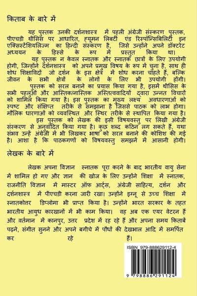 yah lekhak kee peeechadee theesis, hyooman libartee end risponsibilitee in eksistenshiyalijm par aadhaarit hai, jise unhonne apane doktaret adhyayan ke hisse ke roop mein prastut kiya tha. yah pustak na keval snaatak aur snaatak chhaatron ke lie upayogee hogee, jinhonne darshanashaastr ko apane pramukh vishay ke roop mein chuna hai, saath hee shodh shikshaavidon jo darshan ke is kshetr mein shodh karana chaahate hain, balki jeevan ke sabhee kshetron ke logon ke lie bhee upayogee hogee. pustak ko saral roop mein prastut kiya gaya hai, isamen theesis ke sabhee pahaluon aur aastik/naastik astitvavaadiyon dvaara unnat vichaaron ko shaamil kiya gaya hai. is pustak ka mukhy lakshy avadhaaranaon ko spasht aur sankshipt tareeke se samajhaana hai jisase paathak ko laabh hoga. maulik dhaaranaon ko vyavasthit aur sthir tareeke se sthaapit kiya gaya hai. is pustak ko lekhak kee isee vishayavastu par likhee angrejee sanskaran se anuvaadit kiya gaya hai. kuchh shabd kathin lag sakate hain, yatha sambhav unhen angrejee mein bhee likhakar bhaasha ko saral banaane kee koshish kee gaee hai. aasha hai ki paathakaganon ko vishayavastu samajhanen mein aasaanee hogee.