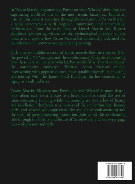 In "Aston Martin: Elegance and Power on Four Wheels," delve into the captivating world of one of the most iconic luxury car brands in history. This book is a journey through the evolution of Aston Martin, a name synonymous with elegance, innovation, and unparalleled performance. From the early days of Lionel Martin and Robert Bamford's pioneering vision to the technological marvels of the modern era, explore how Aston Martin has continually redefined the boundaries of automotive design and engineering. Each chapter unfolds a story of iconic models like the timeless DB5, the powerful V8 Vantage, and the revolutionary Valkyrie, showcasing how these cars are not just vehicles, but works of art that have shaped the automotive landscape. Witness Aston Martin's unique intertwining with popular culture, most notably through its enduring relationship with the James Bond franchise, further cementing its legacy as a cultural icon. "Aston Martin: Elegance and Power on Four Wheels" is more than a book about cars; it's a tribute to a brand that has stood the test of time, constantly evolving while maintaining its core ethos of luxury and excellence. This book is a must-read for car enthusiasts, history buffs, and anyone who appreciates the art of fine craftsmanship and the thrill of groundbreaking innovation. Join us on this exhilarating ride through the history and future of Aston Martin, where every page revs with passion and style.