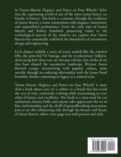 In "Aston Martin: Elegance and Power on Four Wheels," delve into the captivating world of one of the most iconic luxury car brands in history. This book is a journey through the evolution of Aston Martin, a name synonymous with elegance, innovation, and unparalleled performance. From the early days of Lionel Martin and Robert Bamford's pioneering vision to the technological marvels of the modern era, explore how Aston Martin has continually redefined the boundaries of automotive design and engineering. Each chapter unfolds a story of iconic models like the timeless DB5, the powerful V8 Vantage, and the revolutionary Valkyrie, showcasing how these cars are not just vehicles, but works of art that have shaped the automotive landscape. Witness Aston Martin's unique intertwining with popular culture, most notably through its enduring relationship with the James Bond franchise, further cementing its legacy as a cultural icon. "Aston Martin: Elegance and Power on Four Wheels" is more than a book about cars; it's a tribute to a brand that has stood the test of time, constantly evolving while maintaining its core ethos of luxury and excellence. This book is a must-read for car enthusiasts, history buffs, and anyone who appreciates the art of fine craftsmanship and the thrill of groundbreaking innovation. Join us on this exhilarating ride through the history and future of Aston Martin, where every page revs with passion and style.