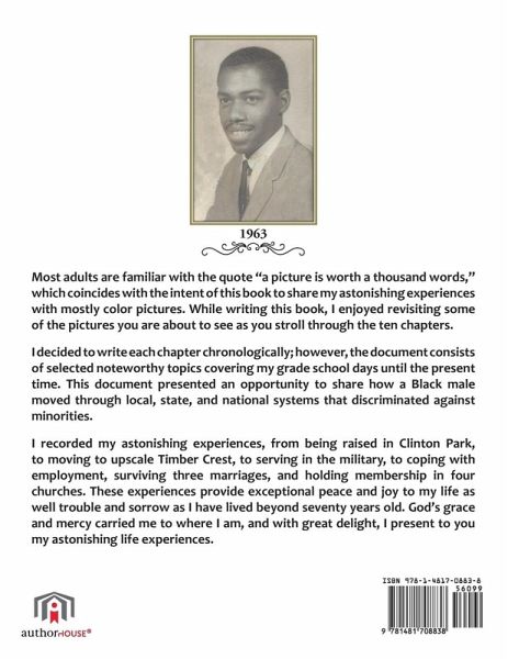 Most adults are familiar with the quote "a picture is worth a thousand words," which coincides with the intent of this book to share my astonishing experiences with mostly color pictures. While writing this book, I enjoyed revisiting some of the pictures you are about to see as you stroll through the ten chapters. I decided to write each chapter chronologically; however, the document consists of selected noteworthy topics covering my grade school days until the present time. This document presented an opportunity to share how a Black male moved through local, state, and national systems that discriminated against minorities. I recorded my astonishing experiences, from being raised in Clinton Park, to moving to upscale Timber Crest, to serving in the military, to coping with employment, surviving three marriages, and holding membership in four churches. These experiences provide exceptional peace and joy to my life as well trouble and sorrow as I have lived beyond seventy years old. God's grace and mercy carried me to where I am, and with great delight, I present to you my astonishing life experiences.