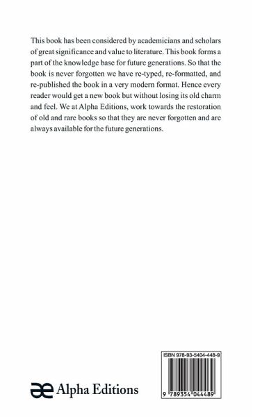This book has been considered by academicians and scholars of great significance and value to literature. This book forms a part of the knowledge base for future generations. So that the book is never forgotten we have re-typed, re-formatted, and re-published the book in a very modern format. Hence every reader would get a new book but without losing its old charm and feel. We at Alpha Editions, work towards the restoration of old and rare books so that they are never forgotten and are always available for the future generations.