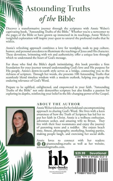 Discover a transformative journey through the scriptures with Annie Weber's captivating book, "Astounding Truths of the Bible." Whether you're a newcomer to the pages of the Bible or have grown up immersed in its teachings, Annie Weber's insightful exploration will inspire your quest to unravel the profound truths that lie within. Annie's refreshing approach combines a love for wordplay, nods to pop culture, humor, and personal anecdotes to illuminate the teachings of Jesus and His character. These devotions, brimming with wit and authenticity, offer a unique lens through which to understand the heart of God's message. For those who find the Bible's depth intimidating, this book provides a firm foundation for your journey toward understanding God's love and His purpose for His people. Annie's down-to-earth style serves as a bridge, connecting you to the richness of scripture. Through her words, she presents 100 Astounding Truths that seamlessly blend timeless wisdom with a modern outlook, helping you grasp the enduring relevance of God's Word. Prepare to be uplifted, enlightened, and empowered in your faith. "Astounding Truths of the Bible" not only demystifies scripture but also kindles a passion for exploring its depths, reinforcing your belief in the life-changing power of the Gospel.