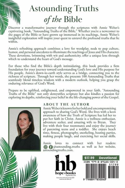 Discover a transformative journey through the scriptures with Annie Weber's captivating book, "Astounding Truths of the Bible." Whether you're a newcomer to the pages of the Bible or have grown up immersed in its teachings, Annie Weber's insightful exploration will inspire your quest to unravel the profound truths that lie within. Annie's refreshing approach combines a love for wordplay, nods to pop culture, humor, and personal anecdotes to illuminate the teachings of Jesus and His character. These devotions, brimming with wit and authenticity, offer a unique lens through which to understand the heart of God's message. For those who find the Bible's depth intimidating, this book provides a firm foundation for your journey toward understanding God's love and His purpose for His people. Annie's down-to-earth style serves as a bridge, connecting you to the richness of scripture. Through her words, she presents 100 Astounding Truths that seamlessly blend timeless wisdom with a modern outlook, helping you grasp the enduring relevance of God's Word. Prepare to be uplifted, enlightened, and empowered in your faith. "Astounding Truths of the Bible" not only demystifies scripture but also kindles a passion for exploring its depths, reinforcing your belief in the life-changing power of the Gospel.