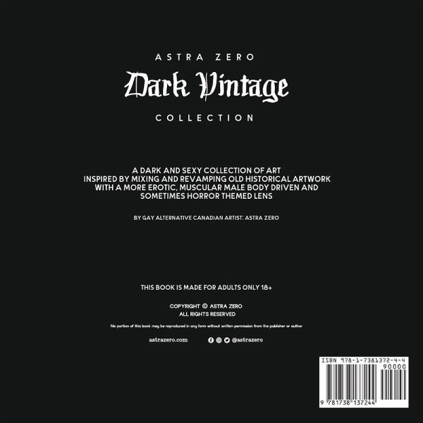 Dive into the seductive world of art with the the Dark Vintage Collection. Created by gay Canadian artist Astra Zero. This is the first book in the collection that reimagines historical artworks with a provocative twist, focusing on the muscular male form through a lens that occasionally touches on the macabre and the erotic. In this captivating book, you'll find both direct reinterpretations of classic pieces, replacing sultry women with men, and original works that infuse a queer male gothic approach with elements of fantasy and horror. Perfect for gay men and art enthusiasts alike, this collection celebrates the allure of the male body in all its sensuality. Explore the tantalizing, dark, and seductive side of art, as Astra Zero's work blurs the lines between history and desire, offering a unique and sometimes controversial perspective on timeless classics. This 8.5x8.5" book is designed with the main artworks displayed on the right pages with brief descriptions on the left, for those who may wish to remove pages for display.