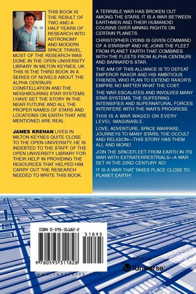 A TERRIBLE WAR HAS BROKEN OUT AMONG THE STARS. IT IS A WAR BETWEEN EARTHMEN AND THEIR HUMANOID COUSINS OVER MINING RIGHTS ON CERTAIN PLANETS. CHRISTOPHER LYONS IS GIVEN COMMAND OF A STARSHIP AND HE JOINS THE FLEET FROM PLANET EARTH THAT COMBINES WITH THE FLEETS FROM ALPHA CENTAURI AND BARNARD'S STAR. THE AIM OF THIS ALLIANCE IS TO DEFEAT EMPEROR RAXOR AND HIS AMBITIOUS FRIENDS, WHO PLAN TO EXTEND RAXOR'S EMPIRE NO MATTER WHAT THE COST. THE WAR ESCALATES AND INVOLVES MANY STAR SYSTEMS. THE SUFFERING INTENSIFIES AND SUPERNATURAL FORCES INTERFERE WITH THE WAR'S PROGRESS. THIS IS A WAR WAGED ON EVERY LEVEL IMAGINABLE. LOVE, ADVENTURE, SPACE WARFARE, JOURNEYS TO MANY STARS, THE OCCULT AND RELIGION - THIS STORY HAS THEM ALL AND MORE! JOIN THE SPACEFLEET FROM EARTH IN ITS WAR WITH EXTRATERRESTRIALS - A WAR SET IN THE 22ND CENTURY AD! IT IS A WAR THAT TAKES PLACE CLOSE TO PLANET EARTH!
