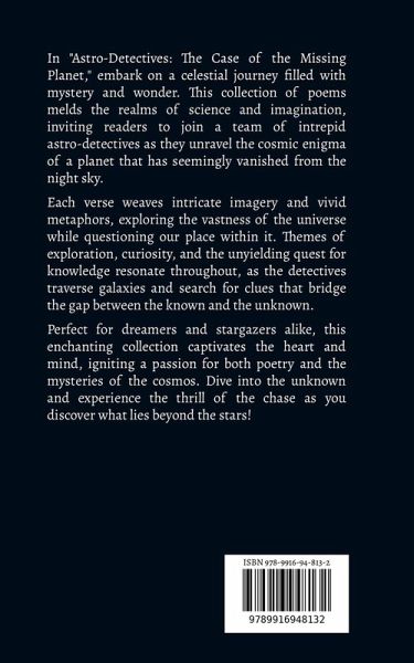 In "Astro-Detectives: The Case of the Missing Planet," embark on a celestial journey filled with mystery and wonder. This collection of poems melds the realms of science and imagination, inviting readers to join a team of intrepid astro-detectives as they unravel the cosmic enigma of a planet that has seemingly vanished from the night sky. Each verse weaves intricate imagery and vivid metaphors, exploring the vastness of the universe while questioning our place within it. Themes of exploration, curiosity, and the unyielding quest for knowledge resonate throughout, as the detectives traverse galaxies and search for clues that bridge the gap between the known and the unknown. Perfect for dreamers and stargazers alike, this enchanting collection captivates the heart and mind, igniting a passion for both poetry and the mysteries of the cosmos. Dive into the unknown and experience the thrill of the chase as you discover what lies beyond the stars!