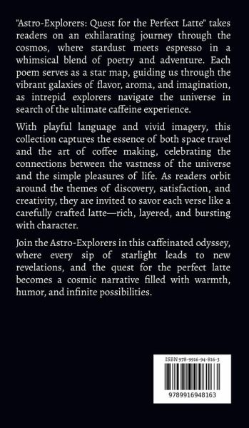 "Astro-Explorers: Quest for the Perfect Latte" takes readers on an exhilarating journey through the cosmos, where stardust meets espresso in a whimsical blend of poetry and adventure. Each poem serves as a star map, guiding us through the vibrant galaxies of flavor, aroma, and imagination, as intrepid explorers navigate the universe in search of the ultimate caffeine experience. With playful language and vivid imagery, this collection captures the essence of both space travel and the art of coffee making, celebrating the connections between the vastness of the universe and the simple pleasures of life. As readers orbit around the themes of discovery, satisfaction, and creativity, they are invited to savor each verse like a carefully crafted latte-rich, layered, and bursting with character. Join the Astro-Explorers in this caffeinated odyssey, where every sip of starlight leads to new revelations, and the quest for the perfect latte becomes a cosmic narrative filled with warmth, humor, and infinite possibilities.