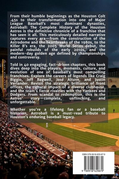 From their humble beginnings as the Houston Colt .45s to their transformation into one of Major League Baseball's most dominant dynasties, Astroball: The Complete History of the Houston Astros is the definitive chronicle of a franchise that has seen it all. This meticulously detailed narrative captures every era-from the construction of the Astrodome and the heartbreaks of the 1980s, to the Killer B's era, the 2005 World Series debut, the painful rebuilds of the early 2010s, and the modern-day golden age defined by championships and controversy. Told in 40 engaging, fact-driven chapters, this book dives deep into the players, moments, culture, and evolution of one of baseball's most compelling franchises. Explore the careers of legends like Craig Biggio, Jeff Bagwell, José Altuve, and Justin Verlander. Revisit the strategic brilliance of front offices, the cultural impact of a diverse clubhouse, and the team's fierce rivalries with the Yankees and Dodgers. From scandal to redemption, this is the Astros' story-complete, unflinching, and unforgettable. Whether you're a lifelong fan or a baseball historian, Astroball is a must-read tribute to Houston's enduring baseball legacy.