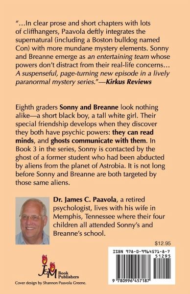 Eighth graders Sonny and Breanne look nothing alike--a short black boy, a tall white girl--and are easy targets for bullies. Their special friendship develops when they discover they both have psychic powers: they can read minds and ghosts communicate with them. In Book 3 of the series, Sonny is contacted by the ghost of a former student who had been abducted by aliens from the planet of Astrobia. It is not long before the aliens also abduct Sonny. He has the intelligence and problem solving ability to escape, but he is too scared to think. Breanne has to summon all of her mind reading skills to make contact with Sonny to calm him enough so that he can find his way home.