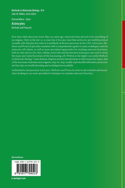 Ever since their discovery more than 150 years ago, astrocytes have proved to be something of an enigma. Only in the last 10-15 years has it become clear that astrocytes are multifunctional versatile cells that play key roles in a multitude of diverse processes in the CNS, including generation of neural stem cells, synaptogenesis, and regulation of the blood-brain barrier and neurovascular unit. Astrocytes: Methods and Protocols provides scientists with a comprehensive guide to many techniques used for astrocyte cell culture, as well as more specialized approaches for studying astrocyte functions, both in vitro and in vivo. Key cellular, molecular and biochemical techniques are used to study the many and varied functions of this fascinating cell. Written in the highly successful Methods in Molecular Biology(TM) series format, chapters include introductions to their respective topics, lists of the necessary materials and reagents, step-by-step, readily reproducible laboratory protocols, and key tips on troubleshooting and avoiding known pitfalls.