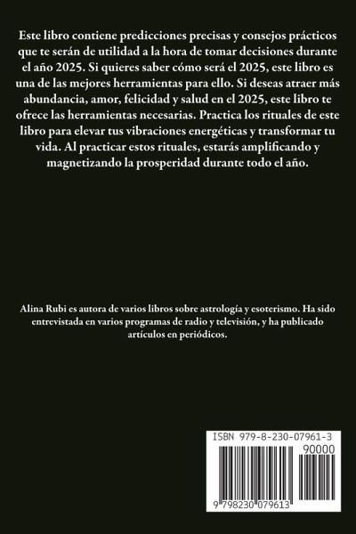 Este libro contiene predicciones precisas y consejos prácticos que te serán de utilidad a la hora de tomar decisiones durante el año 2025. Si quieres saber cómo será el 2025, este libro es una de las mejores herramientas para ello. Si deseas atraer más abundancia, amor, felicidad y salud en el 2025, este libro te ofrece las herramientas necesarias. Practica los rituales de este libro para elevar tus vibraciones energéticas y transformar tu vida. Al practicar estos rituales, estarás amplificando y magnetizando la prosperidad durante todo el año.