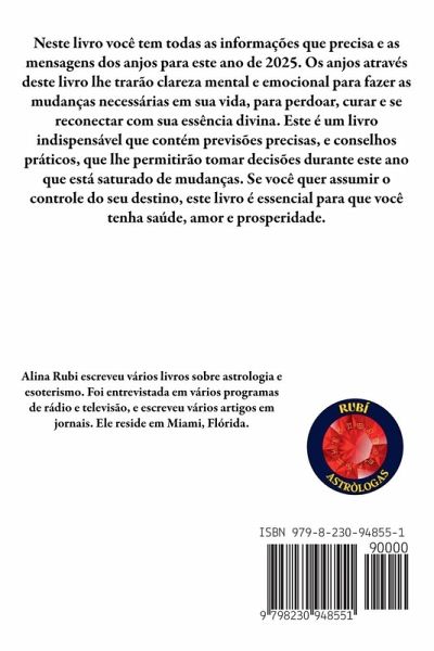 Neste livro você tem todas as informações que precisa e as mensagens dos anjos para este ano de 2025. Os anjos através deste livro lhe trarão clareza mental e emocional para fazer as mudanças necessárias em sua vida, para perdoar, curar e se reconectar com sua essência divina. Este é um livro indispensável que contém previsões precisas, e conselhos práticos, que lhe permitirão tomar decisões durante este ano que está saturado de mudanças. Se você quer assumir o controle do seu destino, este livro é essencial para que você tenha saúde, amor e prosperidade.