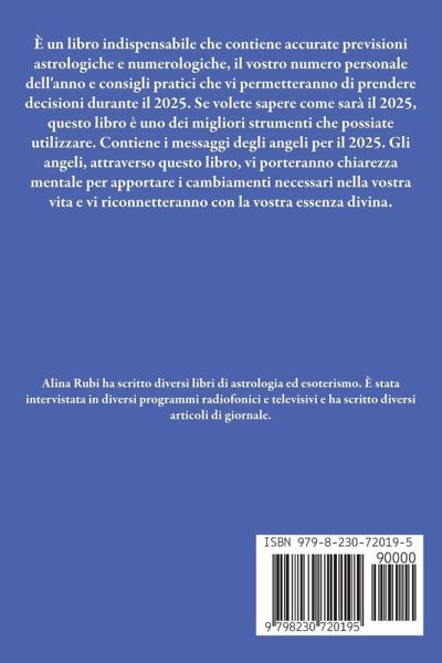 È un libro indispensabile che contiene accurate previsioni astrologiche e numerologiche, il vostro numero personale dell'anno e consigli pratici che vi permetteranno di prendere decisioni durante il 2025. Se volete sapere come sarà il 2025, questo libro è uno dei migliori strumenti che possiate utilizzare. Contiene i messaggi degli angeli per il 2025. Gli angeli, attraverso questo libro, vi porteranno chiarezza mentale per apportare i cambiamenti necessari nella vostra vita e vi riconnetteranno con la vostra essenza divina.