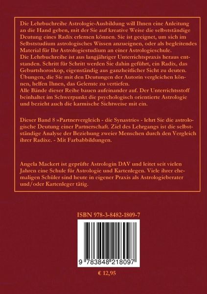 Die Lehrbuchreihe »Astrologie-Ausbildung« will Ihnen eine Anleitung an die Hand geben, mit der Sie auf kreative Weise die selbstständige Deutung eines Radix erlernen können. Sie ist geeignet, um sich im Selbststudium astrologisches Wissen anzueignen, oder als begleitendes Material für Ihr Astrologiestudium an einer Astrologieschule. Die Lehrbuchreihe ist aus langjähriger Unterrichtspraxis heraus entstanden. Schritt für Schritt werden Sie dahin geführt, ein Radix, das Geburtshoroskop, eigenständig aus ganzheitlicher Sicht zu deuten. Übungen, die Sie mit den Deutungen der Autorin vergleichen können, helfen Ihnen, das Gelernte zu vertiefen. Alle Bände dieser Reihe bauen aufeinander auf. Der Unterrichtsstoff beinhaltet im Schwerpunkt die psychologisch orientierte Astrologie und bezieht auch die karmische Sichtweise mit ein. Dieser Band 8 »Partnervergleich - die Synastrie« - lehrt Sie die astrologische Deutung einer Partnerschaft. Ziel des Lehrgangs ist die selbstständige Analyse der Beziehung zweier Menschen durch den Vergleich ihrer Radixe. - Mit Farbabbildungen.Angela Mackert ist geprüfte Astrologin DAV und leitet seit vielen Jahren eine Schule für Astrologie und Kartenlegen. Viele ihrer ehemaligen Schüler sind heute in eigener Praxis als Astrologieberater und/oder Kartenleger tätig.