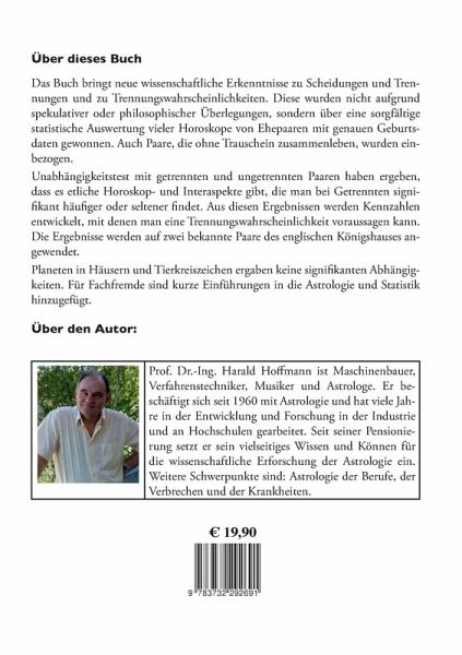 Das Buch bringt neue wissenschaftliche Erkenntnisse zu Scheidungen und Trennungen und zu Trennungswahrscheinlichkeiten.Diese wurden nicht aufgrund spekulativer oder philosophischer Überlegungen, sondern über eine sorgfältige statistische Auswertung vieler Horoskope von Ehepaaren mit genauen Geburtsdaten gewonnen. Auch Paare, die ohne Trauschein zusammenleben, wurden einbezogen.Unabhängigkeitstests mit getrennten und ungetrennten Paaren haben ergeben, dass es etliche Horoskop- und Interaspekte gibt, die man bei Getrennten signifikant häufiger oder seltener findet. Mit diesen Ergebnissen werden Kennzahlen entwickelt, mit denen man eine Trennungswahrscheinlichkeit voraussagen kann.Planeten in Häusern und Tierkreiszeichen ergaben keine signifikanten Abhängigkeiten. Für Fachfremde sind kurze Einführungen in die Astrologie und Statistik hinzugefügt.